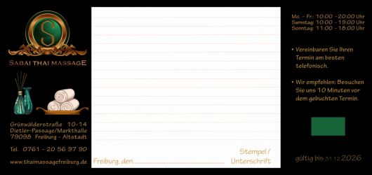 Schenken Sie Ihren Lieben und Freunden einen Sabai Thai Massage - Gutschein. Es ist das ideale Geschenk und sagt dem Beschenkten wie sehr Ihnen dessen Wohlbefinden am Herzen liegt.